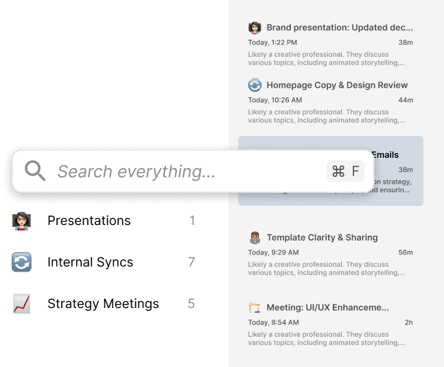 Access all past conversations, decisions, and insights in seconds—everything you need, right when you need it.